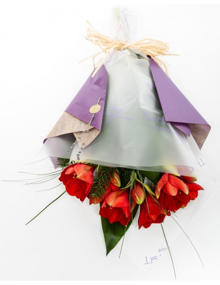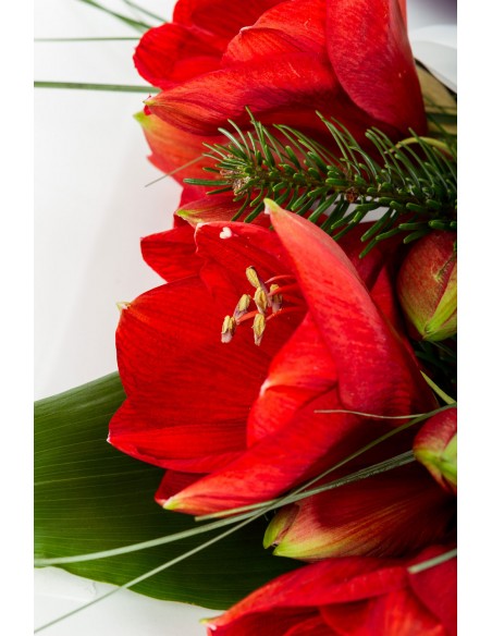 A striking and dramatic flower that is synonymous with Christmas. 3 long stemmed amaryllis look amazing over the festive period. Dressed with aspidistra leaves, Christmas spruce and loose beargrass.