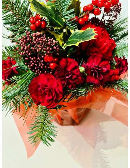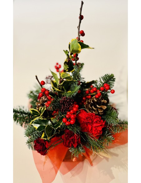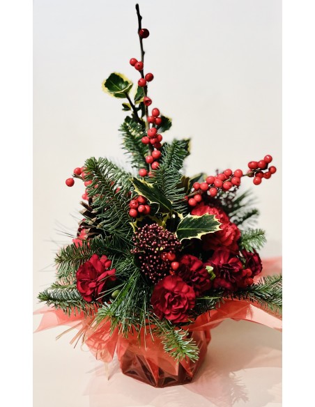 An allround arrangement of festive foliage and long lasting flowers is a beautiful natural display. The oasis is perfectly hidden in red wrap and is a lovely remembrance display and can also be placed directly into your memorial vase.