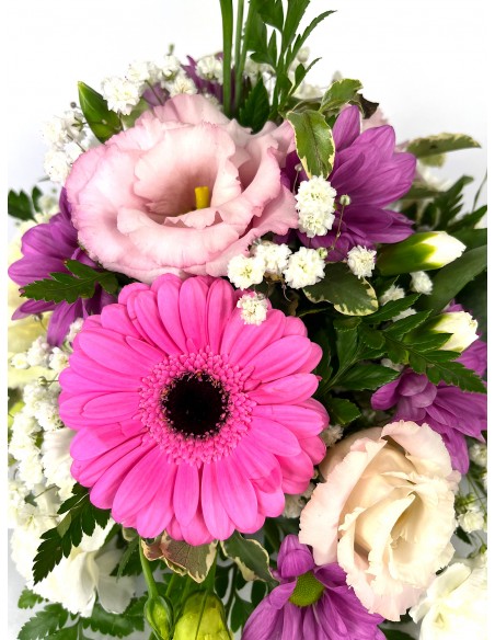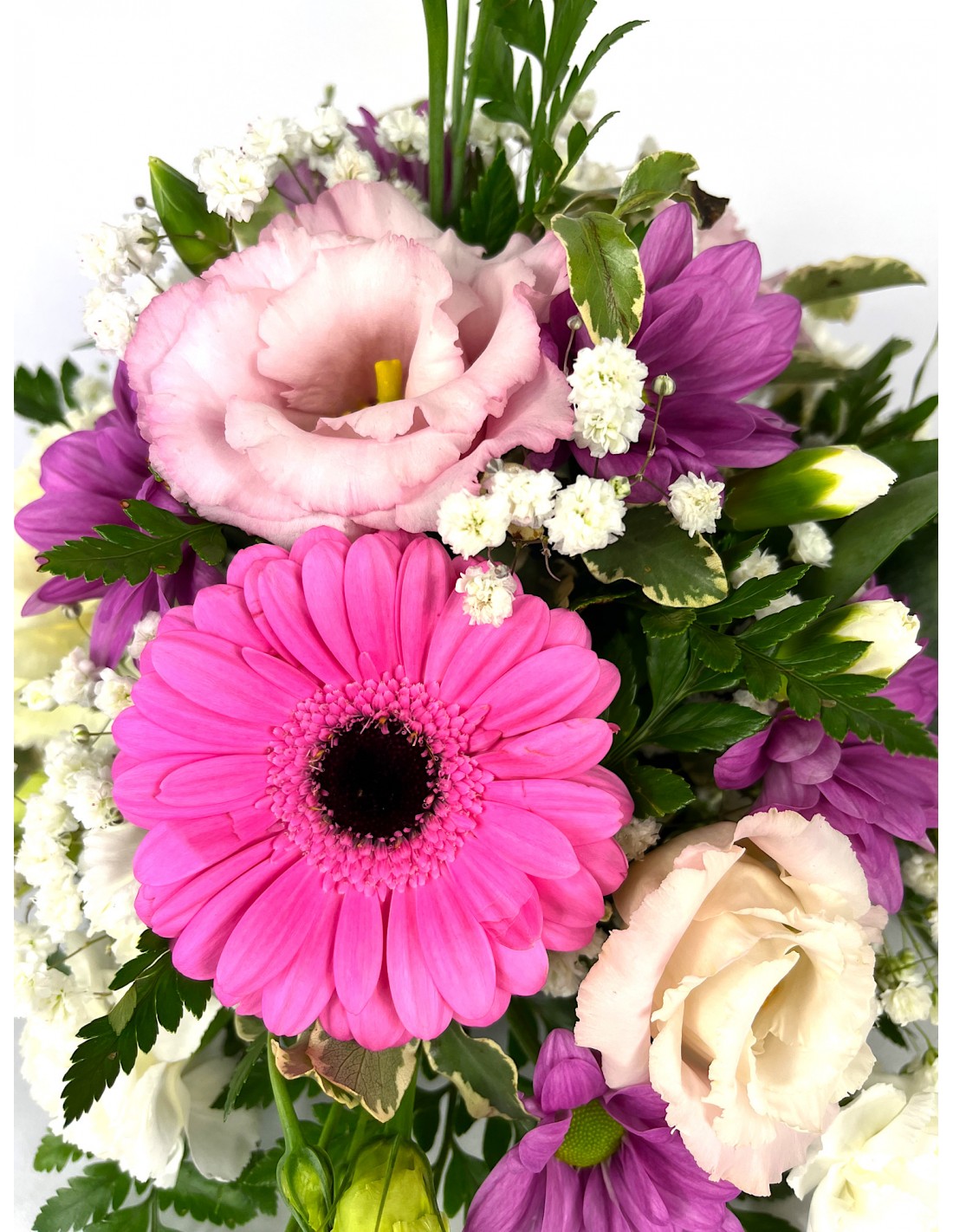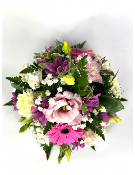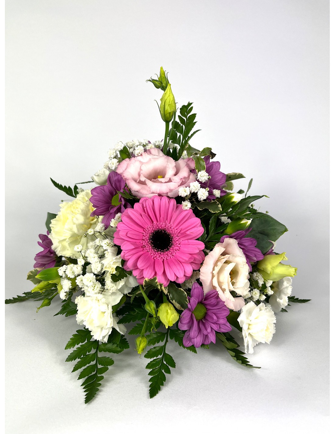 A pretty remembrance posie in shades of pinks, arranged in flower oasis and small floral dish ensures the flowers have water. Designed with an all-round shape having a mixed floral selection and including longer lasting flowers that can withstand outdoor weather.