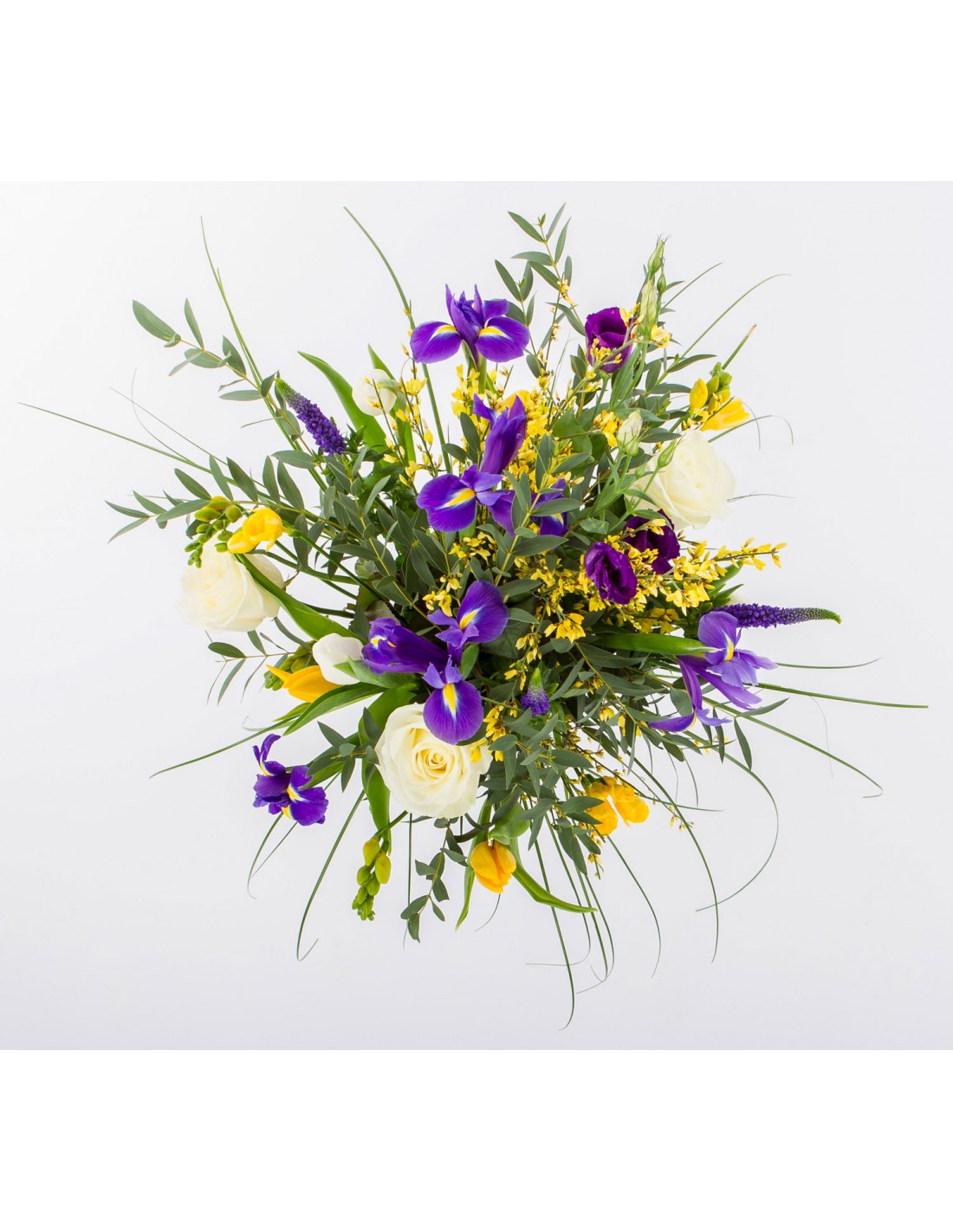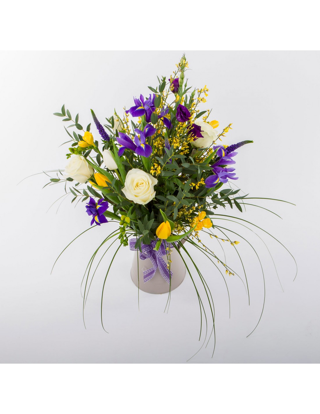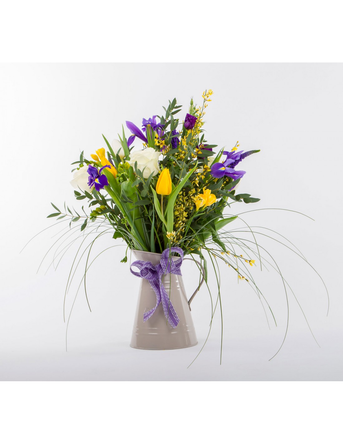A fresh and fragrant loose handtie of spring flowers and exhilarating colours welcomes spring into your home. Large headed white avalanche roses, tulips, lisianthus, iris, fragrant freesia, scented broom and parvi eucalyptus. Displayed and delivered in a mushroom coloured milk jug and co-ordinated with a lilac check hessian ribbon.